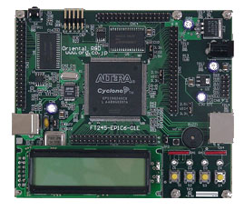 FT245-EP1C6 はアルテラ社のCycloneシリーズFPGAとFTDI社USBコントローラを実装したFPGA評価ボードです。汎用コントローラとしてお使い頂けるような回路構成になっておりますのでFPGA